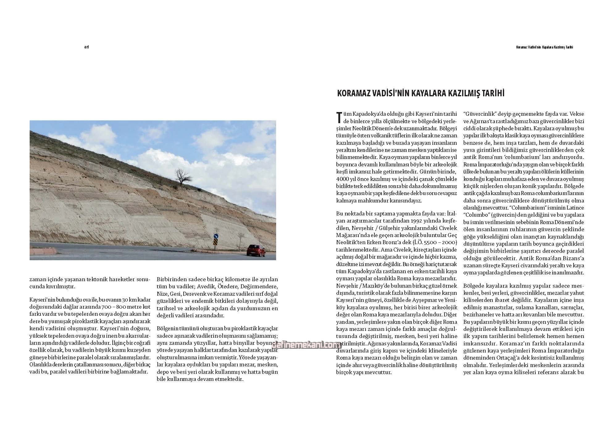 /depo odası mevcuttur. Bu odaların tümü, bilinen diğer Kapadokya yeraltı şehri örnekleriyle karşılaştı-rılamayacak ölçüde büyük ve ferahtır. Tünelin hemen hemen orta kısmında yer alan ve dışarıya açılan bir başka kapı bugün taşla örülerek iptal edilmiştir. Bu girişten 5 m içeride girişi savunmaya yarayan taş kapı bugün mevcut değilse de, bu kapının bulun-duğu operasyon odası belirgindir. Yeraltı şehrinin güneydoğusunda, en son kısımda bir başka giriş/çıkış noktası ve taş kapı daha mevcuttur.