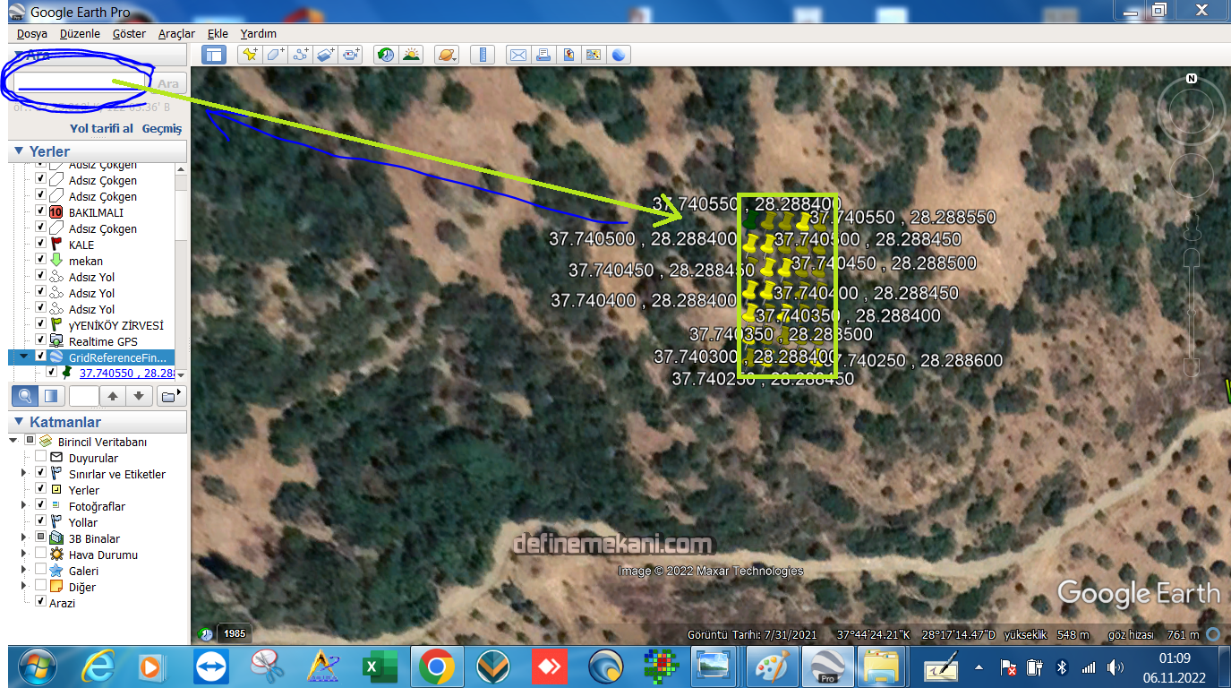 Ustam ben yanlış yazdım sanırım. izlek aldığım kutu içinde çıkıyor sorun yok forumda okuduğum yorumları yada bilgilerde google earth ile alınan kordinat noktası bir gün sonra sahaya gidince sapmalar oluyor. Elimde gps cihazı yok herşeyi google ile yapıyorum. gridreferencefinder sitesinde el ile yapınca google earth da bazen de yükseklikler sıfır oluyor. denize sıfır biryerde yaşamıyorum ama bazen böyle hatalar alıyorum. Bilgisayara format atıp herşeyi sıfırdan yükledim ama bazı aşamadığım sorunlarım var.Şimde ben sana sorsak konu uzayacak10.000bulmuştur çekim adedim 10 adet izlek dışında kalmıştır hedef bununda tek sebebi izlek ve yukseklik yazarken olmasıdır sapmadan beb bunu anlıyorum eğer izleğigridreferencefinde sitesinden yapıyor yuksekliği Google Earth oluşturuyorsan hedefin izlek dışında kalıyorsa sebebini yazdım filitre yöntem falan sebebi olamaz bu duzende işlem yapıyorda sapma varsa tek bir yukseklik yanlışlığı çokçok buyuk kayıpların sebebidir izleklerinizi 5*5 oluşturun hedef çıkarsa o 5*5 olan yere 2*2 izlek döşeyin ve 10 kat dikkatli olun hedifi Google Earth kutusuna yazarak konum tesbitini yapın yazın aratın hedefi ehart buldun mutlak izlek içinde olmalı değilse hatalar belli mesela birden çok hedef çıkarsa hepsini kontrol edin mesela 2 görselde anlatmaya çalıştım*SABIR*Ekli dosyayı görüntüle 15821Ekli dosyayı görüntüle 15822