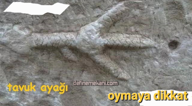 Tavuk ayakları yanında yuvarlak oymalar varsa bu tavuk ayağı değildir. Sizin ayak sandığınız aslında bu oymalara ait mezarlara yön veren ince kanallardır. Özellikle 2 oyma yanında tavuk ayağına benzeyen kanal bulmak mümkündür.