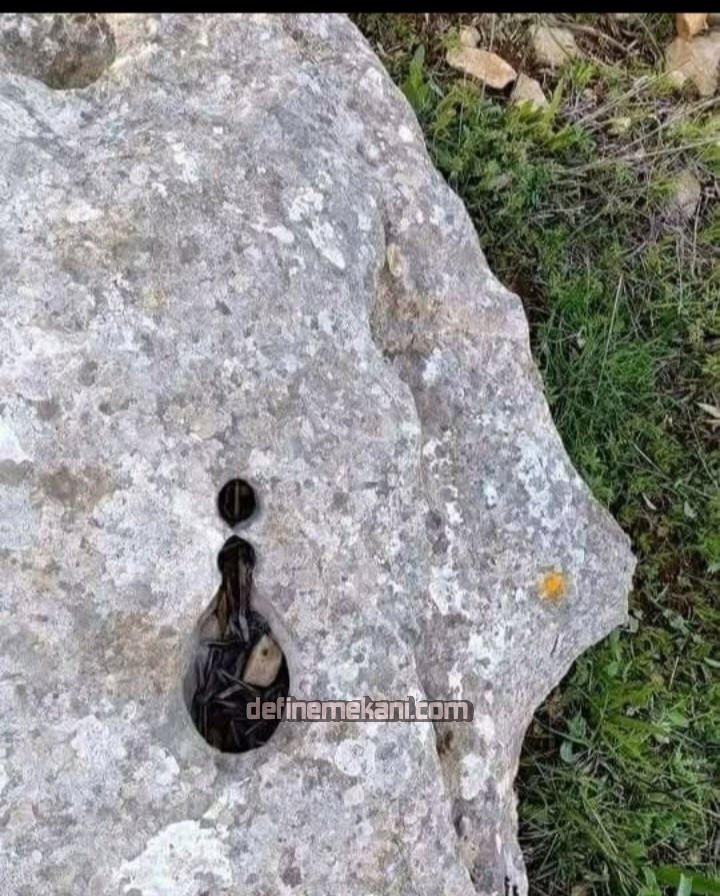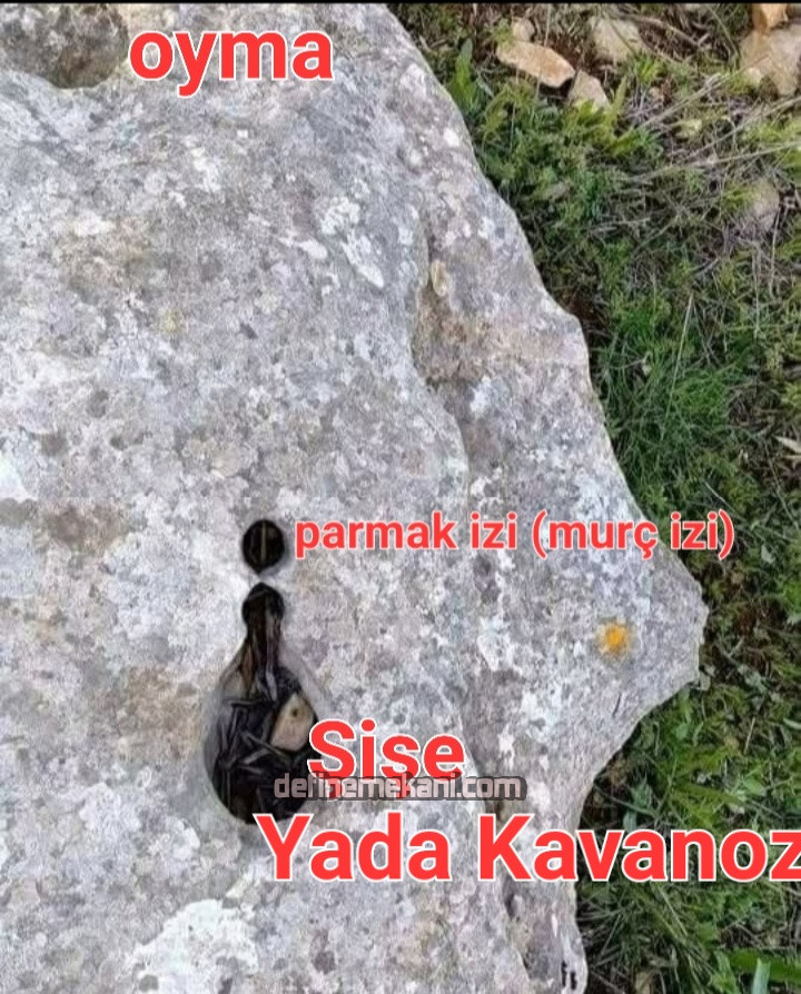 Bu resimde görüldüğü gibi bir parmak izi (bir murç izi var) var bu kayada bir adet şişe içi dolu para bulunmuştur.