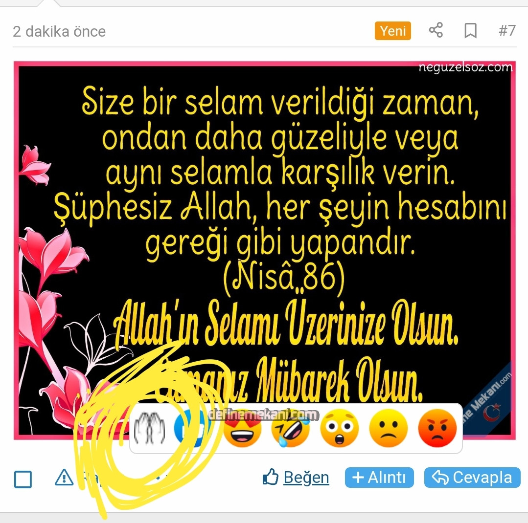 selamunaleykum, Cümleten Cumamız Mübarek olsun.selametle inşaAllah. Ey iman edenler! Cum’a günü namaza çağırıldığı (ezan okunduğu) zaman, hemen Allah’ı anmaya koşun ve alış verişi bırakın. Eğer bilmiş olsanız, elbette bu, sizin için daha hayırlıdır. (Cum’a Suresi ayet 9 ) Cumalarwww.definemekani.com