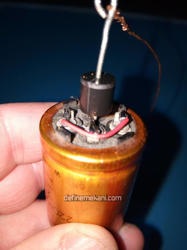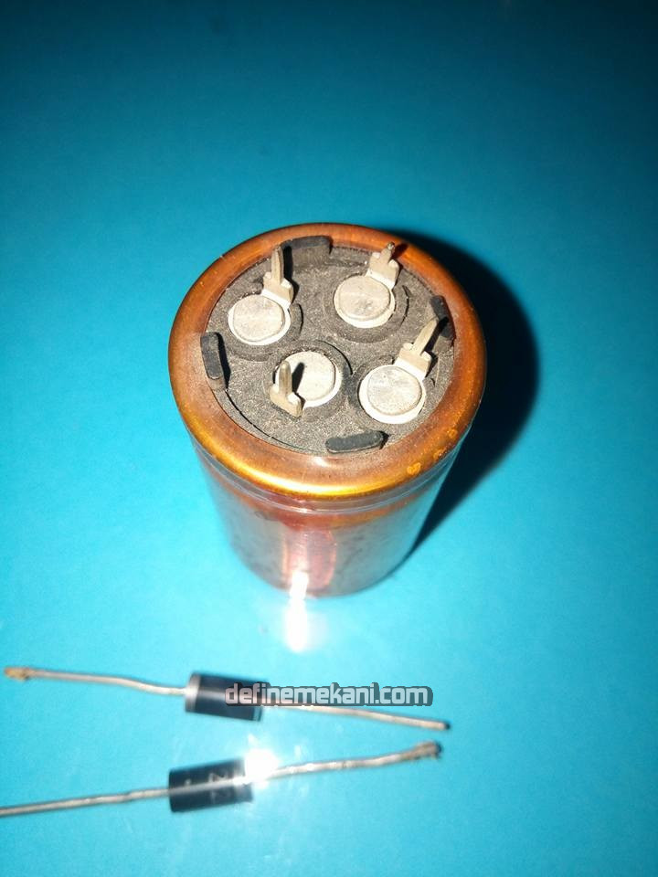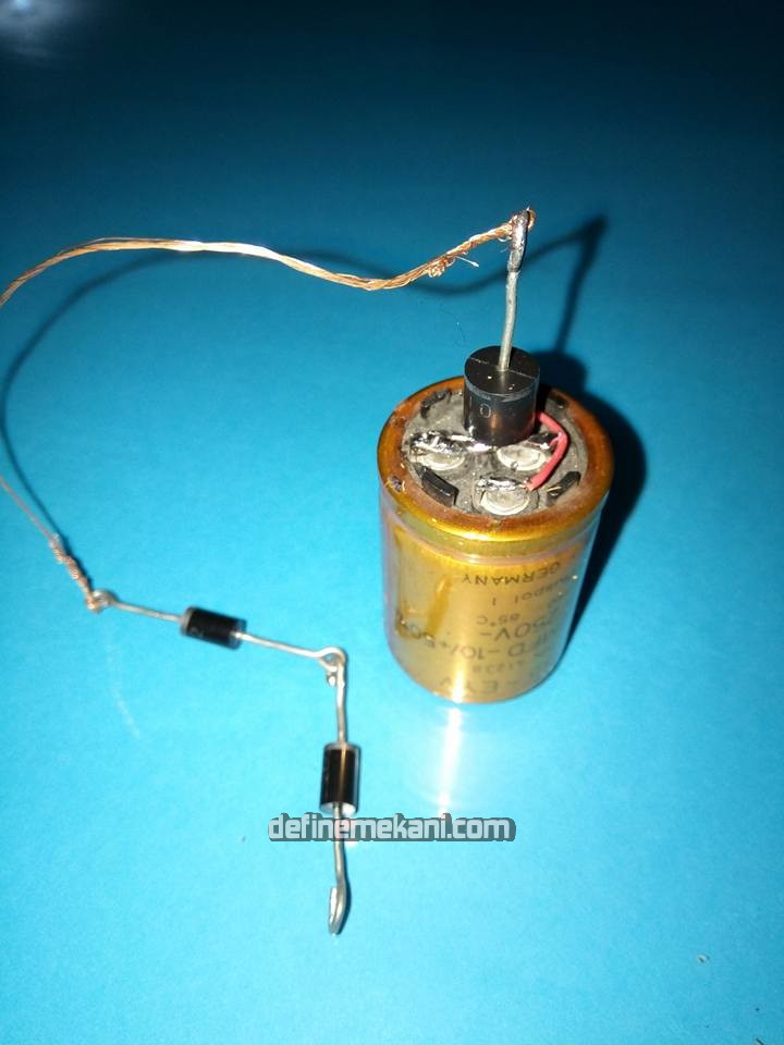 Bir tane 220 MFD KONDANSATÖR (iki kondansatör birarada dört uçlu) Bipolar Bağlam yani ++ ya - - ye KÖPRÜ yap lehimle (konansatör artı uçları boşta bişey bağlanmaz) 1 tane GÜÇLÜ DİYOTUN EKSİ UCUNU EK Sİ KÖPRÜYE LEHİMLE ve artı ucunu kargaburun pense ile küçük bir hal ka yap (kablo içi saç tellerden beşini büküp tek tel yap)15 santimlik bu ba kır teli diyotun halkasına bük bağla telin öbür ucuna da İKİNCİ DİYOTUN ise ARTI UCUNU halka yap ve teli bu