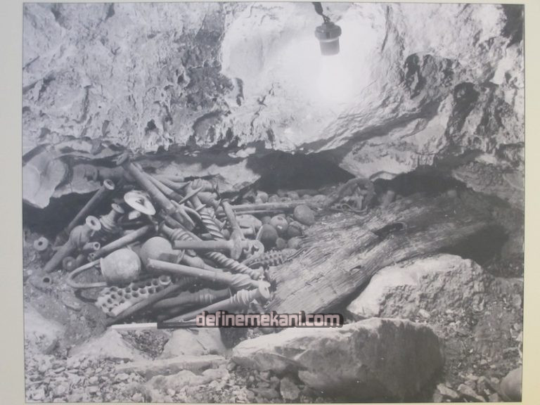 Kalkolitik mağaranın uzak bir köşesine gömülmüş olan bu bütün koleksiyon, toplam 442 parçadan oluşuyor; bunların 429’u bakır (balta ve bıçaklar dâhil). Ayrıca altı mika, bir taş, beş su aygırı (hipopotam) dişi parça ve bir fil kemiğinden iğne bulunuyor.