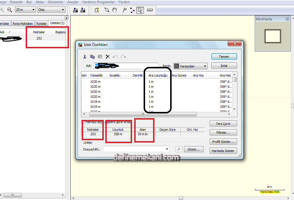 mapsourceyla açıp baktım,nokta aralığı yaklaşık 1 km.100 m..
