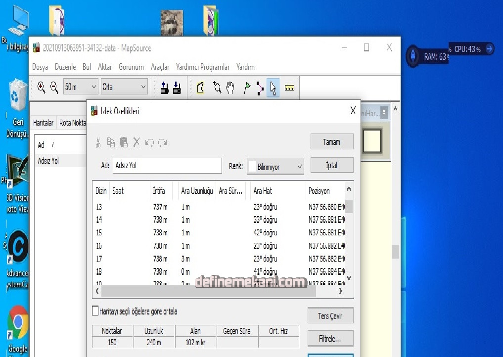 masa başında mapsource almaya çalışsan saat tarih ve Rakımı vermez...ama şöyle yap earthte YOL EKLE den kml olarak izlek al GPSvizualizer de gpx olarak data çıktısını al..bu datayı mapsourceye tanıt karşıma bu resim gibi sonuç çıkacak izlek kısmında o sayfayı komple kopyala excele at..fazlalık sutunları sil.....